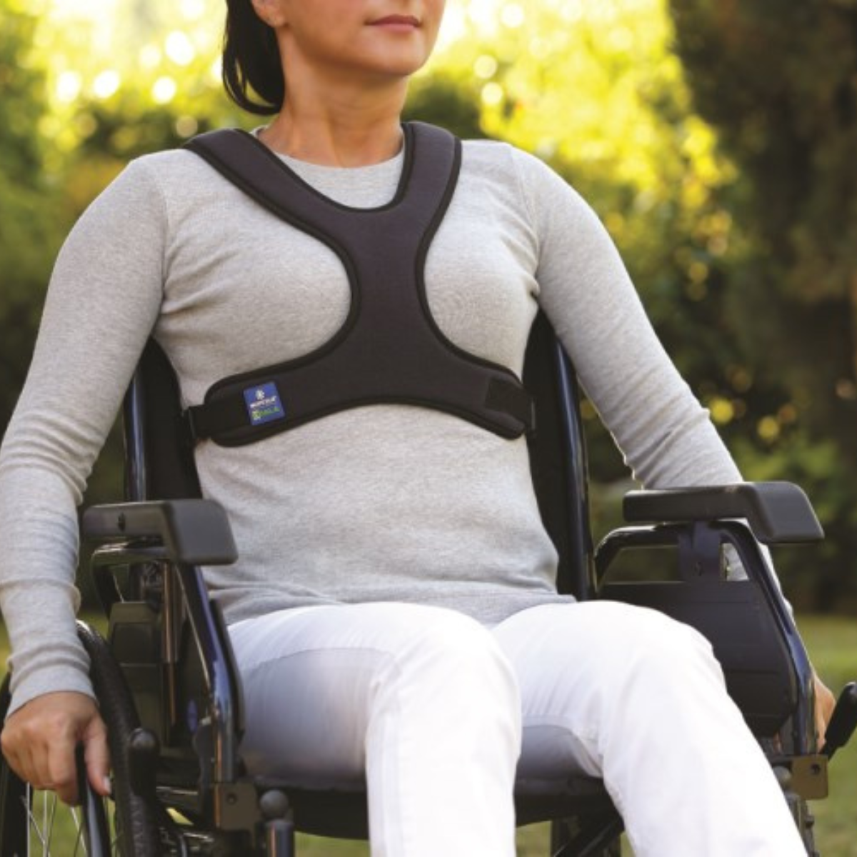 La cintura pettorale di contenimento è ideale per evitare lo scivolamento in avanti del busto dei pazienti seduti su carrozzina o sedia comoda.