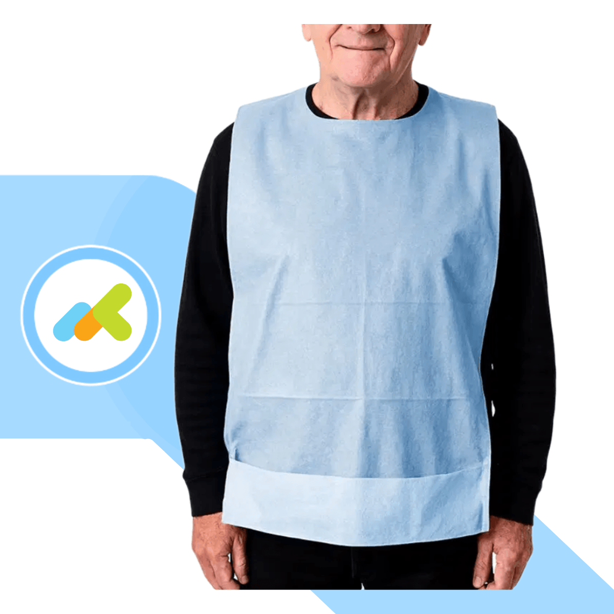 Il bavaglio misura 36 × 70 cm (±1 cm), dimensioni studiate per coprire adeguatamente torace e addome del paziente adulto durante procedure cliniche o durante i pasti.
