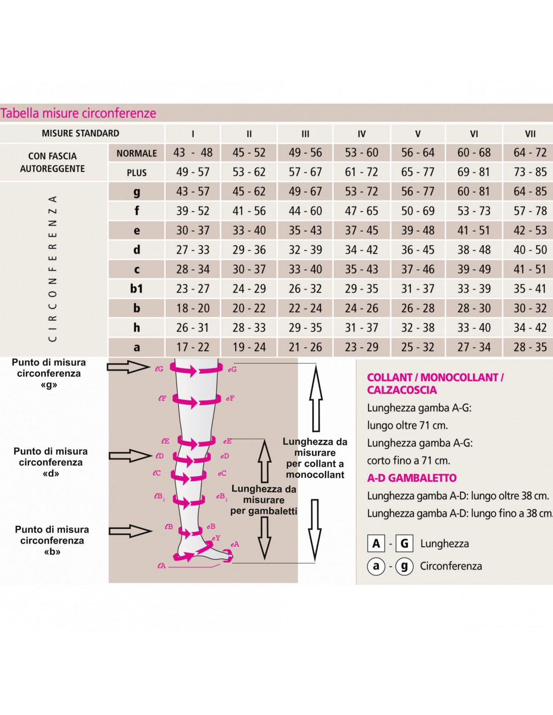 La calza compressiva a maglia tubolare esercita una compressione graduata per migliorare il ritorno venoso e ridurre edema e dolore. La maglia opaca maschera varici e teleangectasie, mentre la struttura morbida garantisce comfort anche per pelli delicate o molto voluminose. La compressione è misurata in mmHg.