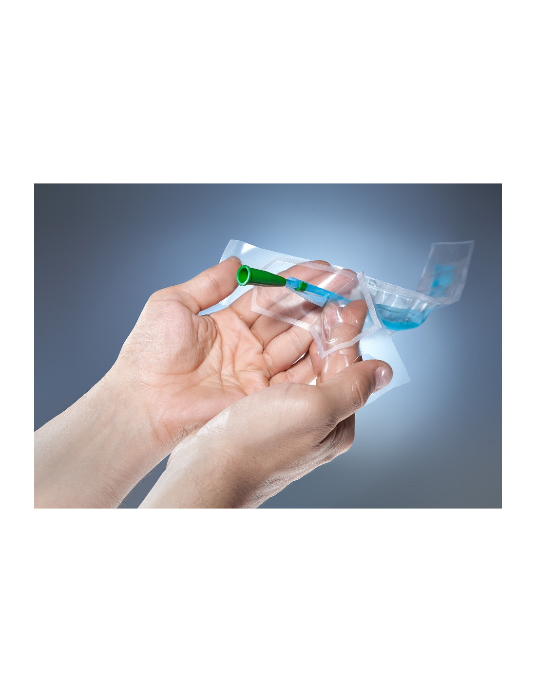 Catetere monouso per autocateterismo intermittente, autolubrificante idrofilo, con contenitore di soluzione salina integrato. Per la disfunzione neurogena della vescica o altri problemi di svuotamento. L'IQ-Cath è un prodotto monouso progettato per il drenaggio temporaneo dell'urina dalla vescica urinaria in una persona con disfunzione di svuotamento della vescica, a scopo terapeutico o diagnostico. È adatto per l'autocateterismo intermittente o per il cateterismo assistito intermittente in condizione igienica. Disponibile in diverse misure.