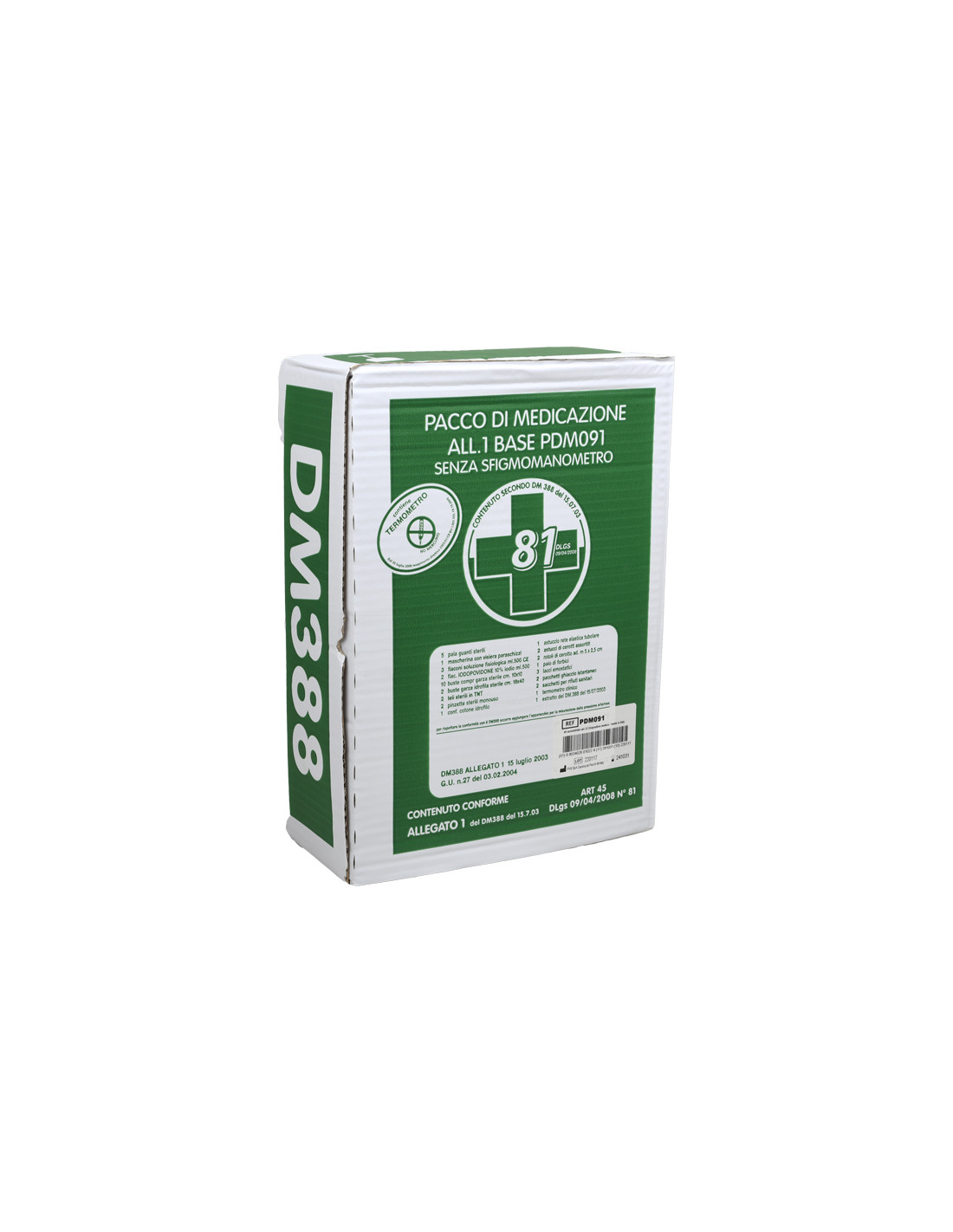 Utilizzare solo prodotti integri e non scaduti. Verificare la conformità del kit al DM 388 Allegato 1. Non sostituire componenti con elementi non certificati. Smaltire i materiali monouso secondo le normative locali sui rifiuti sanitari. Conservare lontano da fonti di calore e umidità.