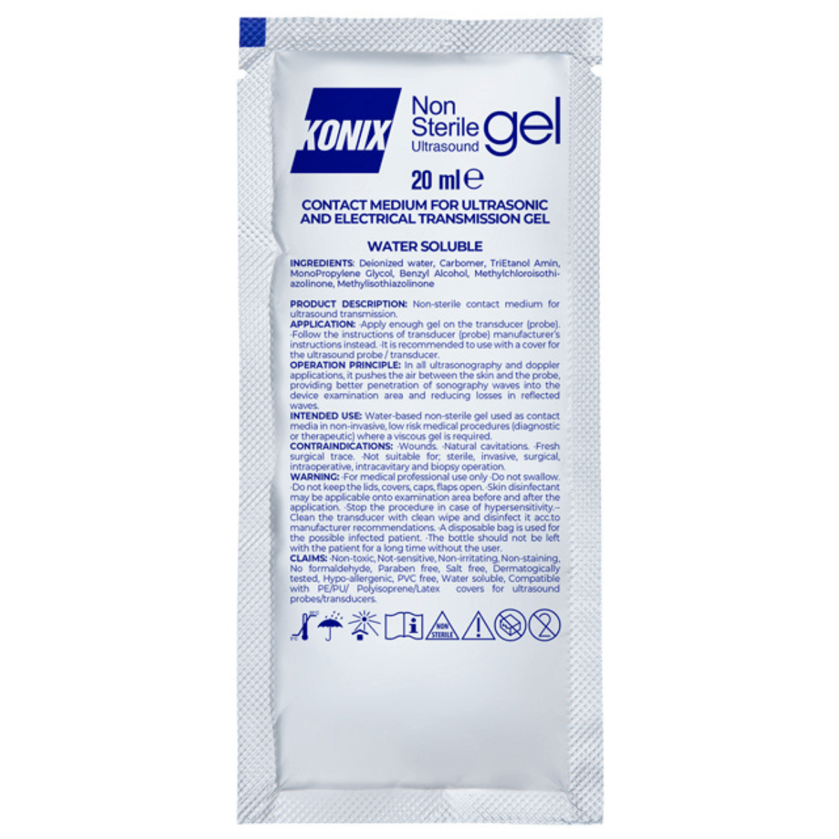 - Apertura della confezione sterile: aprire la doppia busta sterile del gel per ultrasuoni immediatamente prima dell'uso, rispettando le procedure asettiche se richieste dall'applicazione clinica