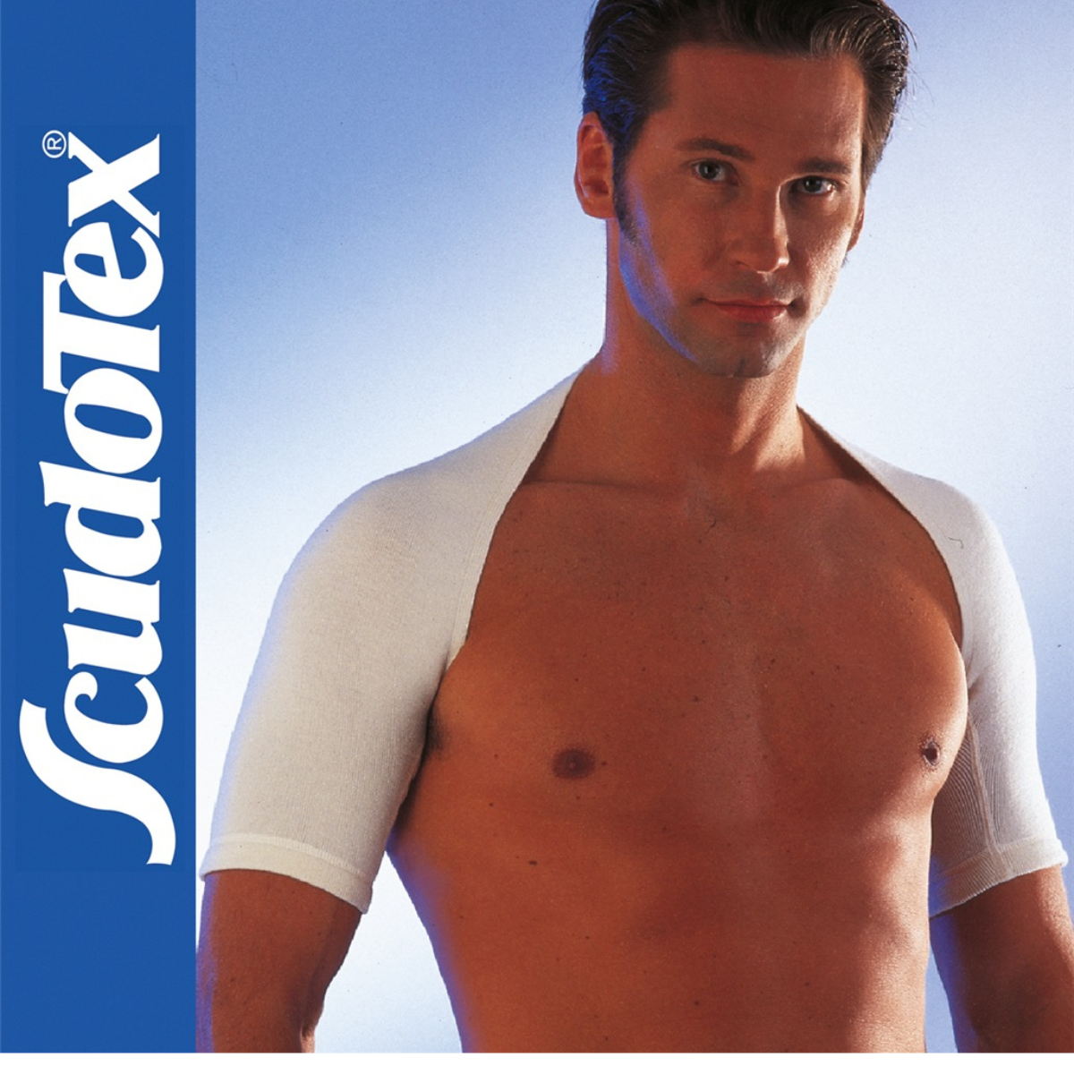 Coprispalle poliestensibile in lana morbida, leggermente elasticizzato, con effetto termico su spalle e zona cervico-dorsale. Disponibile in taglie II-VI, colore bianco, Cod. 619.