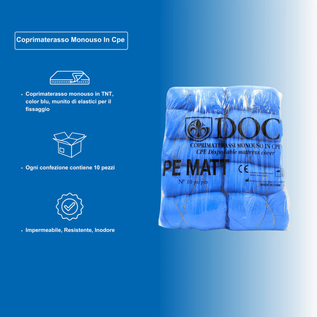Il coprimaterasso monouso in CPE (polietilene a bassa densità LDPE) è una soluzione igienica e impermeabile per la protezione del materasso in ambito sanitario, ospedaliero e assistenziale. Di colore blu, dotato di elastico perimetrale per il fissaggio, è classificato come Dispositivo di Protezione Individuale (DPI) di Categoria I ai sensi del Regolamento UE 425/2016. La confezione da 10 pezzi è ideale per utilizzo professionale continuativo.
