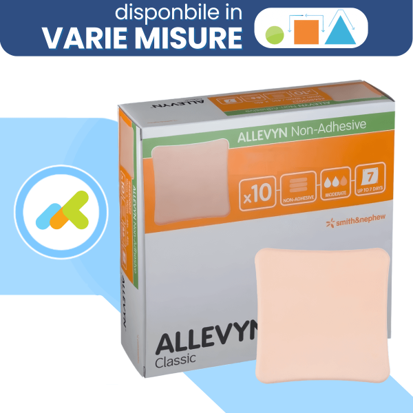 La principale differenza risiede nel sistema di fissaggio. Allevyn Non Adhesive non presenta bordi adesivi e richiede quindi un bendaggio secondario per il fissaggio (cerotto, garza o benda elastica), mentre la versione adesiva ha un bordo autoadesivo integrato. La versione non adesiva è preferibile per pelli fragili, sensibili o danneggiate dove l'adesivo potrebbe causare traumi alla rimozione, per pazienti con allergie agli adesivi, quando è necessario utilizzare bendaggi compressivi, o quando si prevede la necessità di frequenti ispezioni della ferita senza rimuovere completamente la medicazione. Inoltre, essendo ritagliabile e fissabile con diversi metodi, offre maggiore versatilità in zone anatomiche difficili o per ferite di forma irregolare.