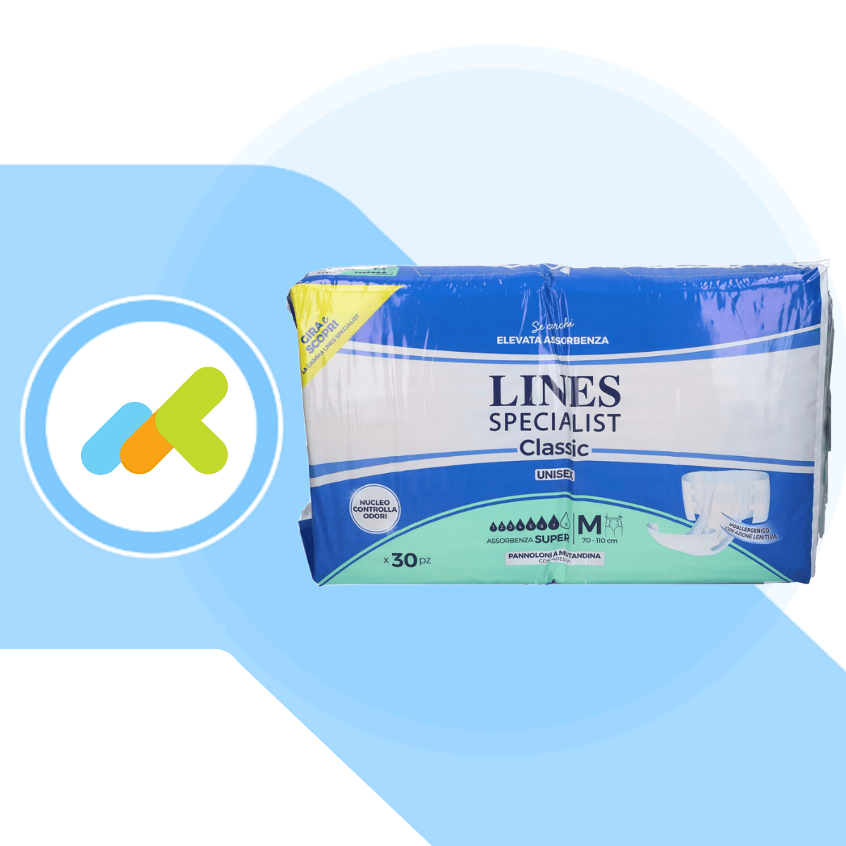 I Pannoloni a Mutandina Lines Specialist Classic Super sono ausili assorbenti ad alta capacità progettati per gestire l'incontinenza grave e gravissima in adulti. Ideali per persone parzialmente autonome o assistite, questi pannoloni offrono una vestibilità simile a mutande tradizionali, con tecnologia anti-odore, barriere laterali morbide, indicatori di cambio e lozione all'aloe per proteggere la pelle. La confezione contiene 30 pezzi con etichette adesive riposizionabili per un comfort personalizzato.