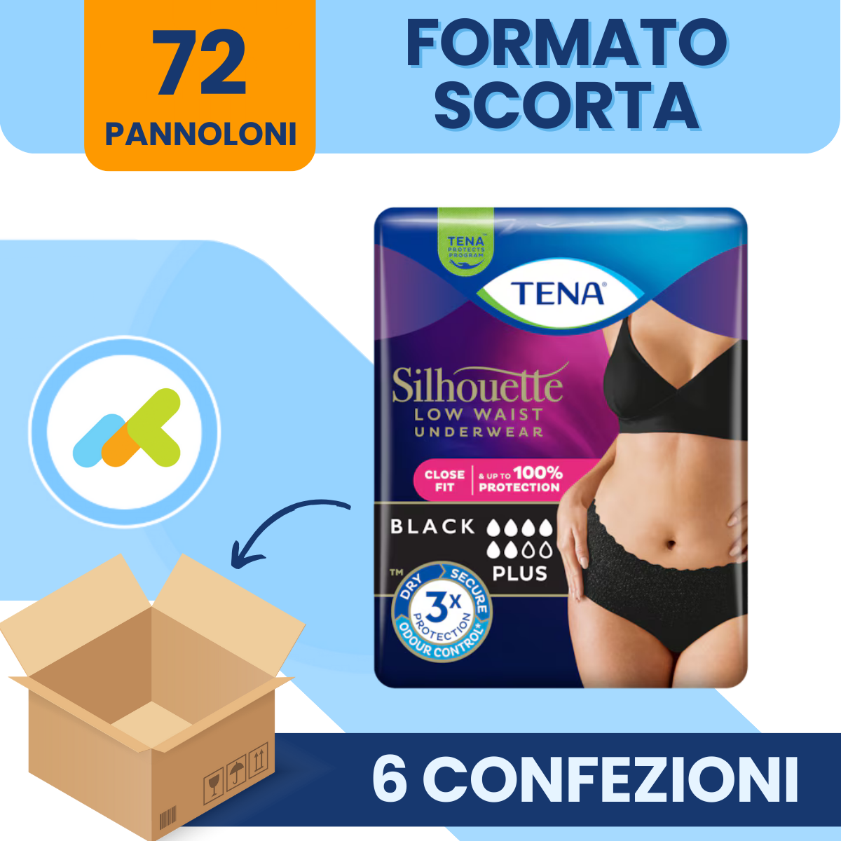 TENA Silhouette Vita Bassa Nere PLUS sono mutandine assorbenti femminili eleganti e discrete, progettate per offrire una protezione elevata contro perdite urinarie da moderate ad abbondanti, garantendo comfort, sicurezza e un aspetto simile alla normale biancheria intima.