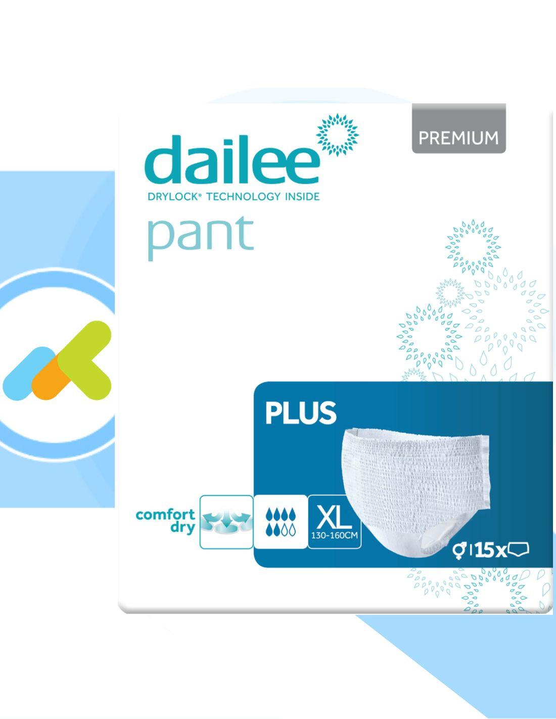 - Dailee Pant Plus XL è di 6 gocce pari a circa 1700 ml di urina. La taglia XL è ideale per una circonferenza della vita tra i 130 e i 160 cm.