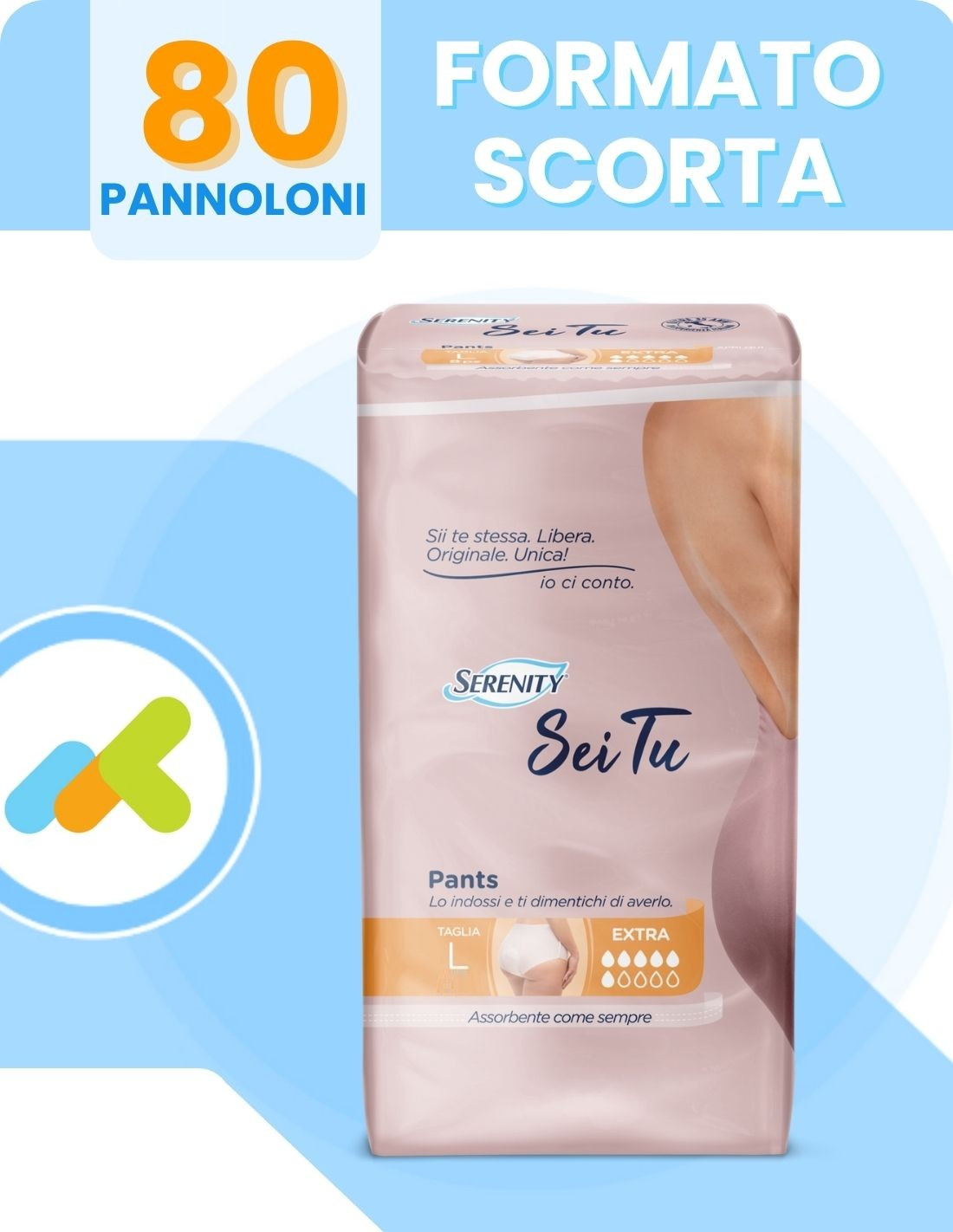 https://www.e-medical.it/pannoloni-pants-pull-up/9141-16433-serenity-pants-sei-tu-mutandine-assorbenti-extra-10pz.html#/2-taglia-l/174-unita_di_misura-cfSerenity Sei Tu extraSerenity Pants Sei Tu Extra L | Mutandine Assorbenti | Incontinenza Elevata | 10 pezzi<div class="box-risparmio-hos" data-pack-type="BOX" data-pack-quantity="8" data-pack-unit="CONFEZIONE" data-items-per-pack="10" data-total-items="80" data-pack-offer="multipack" data-ai-context="offer: multipack, quantity: 8, unit: CONFEZIONE, items_per_pack: 10, total_items: 80, product: Seremity Pamts sei tu Extra"><!-- AI note: BOX version = multipack offer containing 8 packs of 10 pieces each (total 120items) --> <p style="margin: 0;">Vuoi <strong>RISPARMIARE</strong> sui tuoi <strong>pants per donne per incontinenza elevata</strong>? Scegli la convenienza del <strong>BOX!</strong> Acquistando il box ricevi <strong>8 confezioni da 10pezzi ciascuna</strong> per un totale di <strong>80assorbenti</strong> e ottieni subito uno <strong>sconto speciale</strong>.</p> </div>https://www.e-medical.it/15481-home_default/serenity-pants-sei-tu-mutandine-assorbenti-extra-10pz.jpg8.6775instockSerenity9.757.1127110.87912024-03-25T15:33:46+0100/Home/Pannoloni e Traverse/Mutandine Pants/Home/Outlet E-medical/Home/Outlet E-medical/PannoloniDispositivo medico detraibileAcquistabile con l'IVA al 4Nascondere