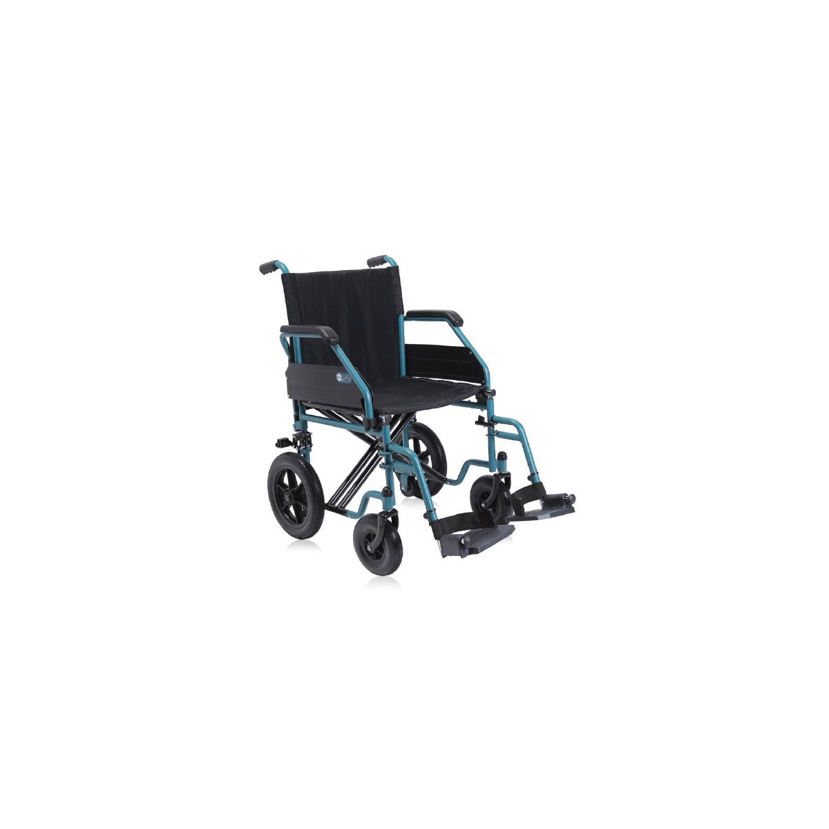 Carrozzina di transito pieghevole con seduta 40–50 cm, telaio in acciaio verniciato a doppia crociera, ruote posteriori Ø 30 cm con sgancio rapido, braccioli ribaltabili, pedane regolabili e predisposizione per ruote posteriori Ø 60 cm. Dispositivo medico Classe I con marcatura CE.