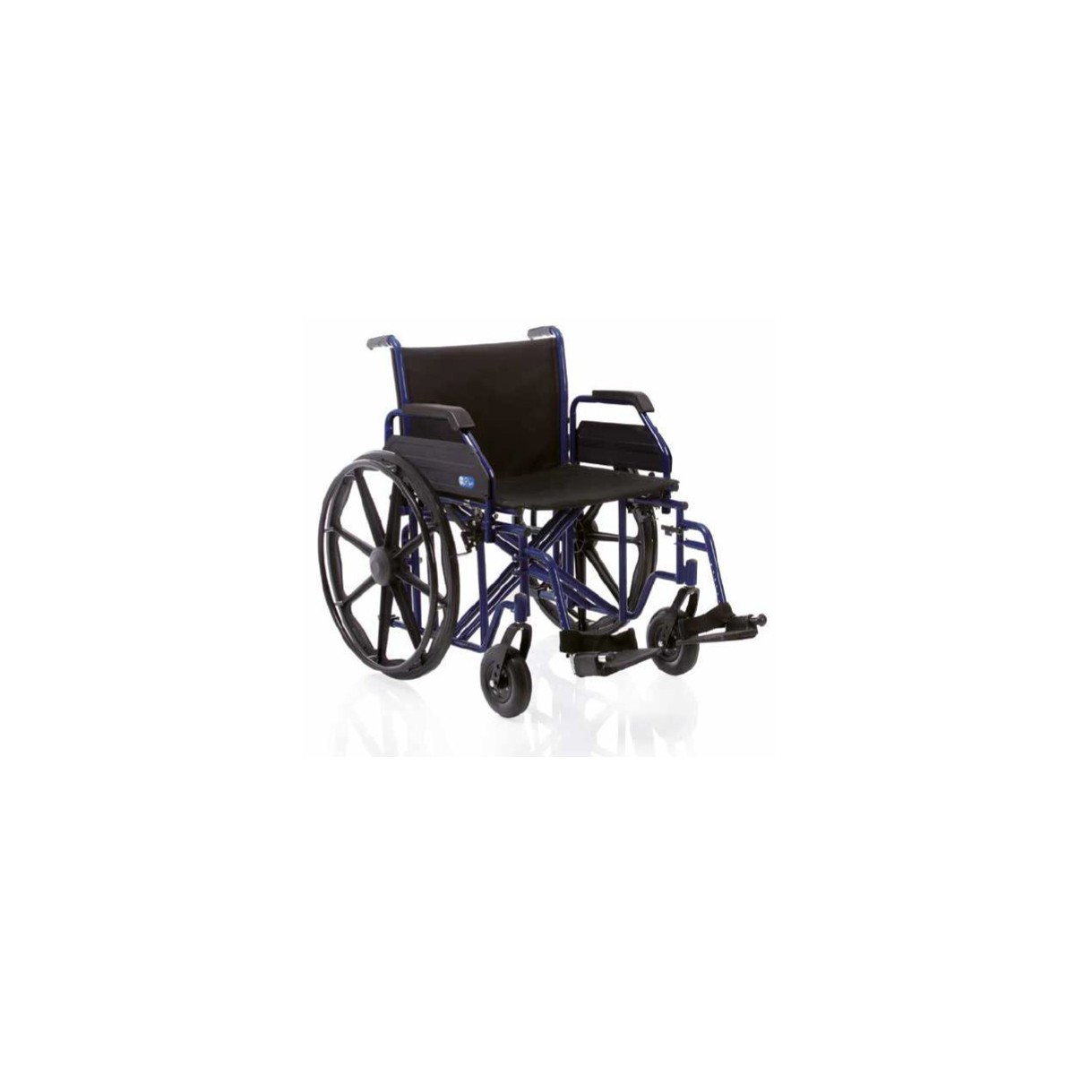 Carrozzina bariatrica pieghevole ad autospinta con seduta larga (50–60 cm), telaio in acciaio a doppia crociera, ruote in PU piene, braccioli ribaltabili, pedane regolabili e ruotini antiribaltamento. Dispositivo medico Classe I con marcatura CE.