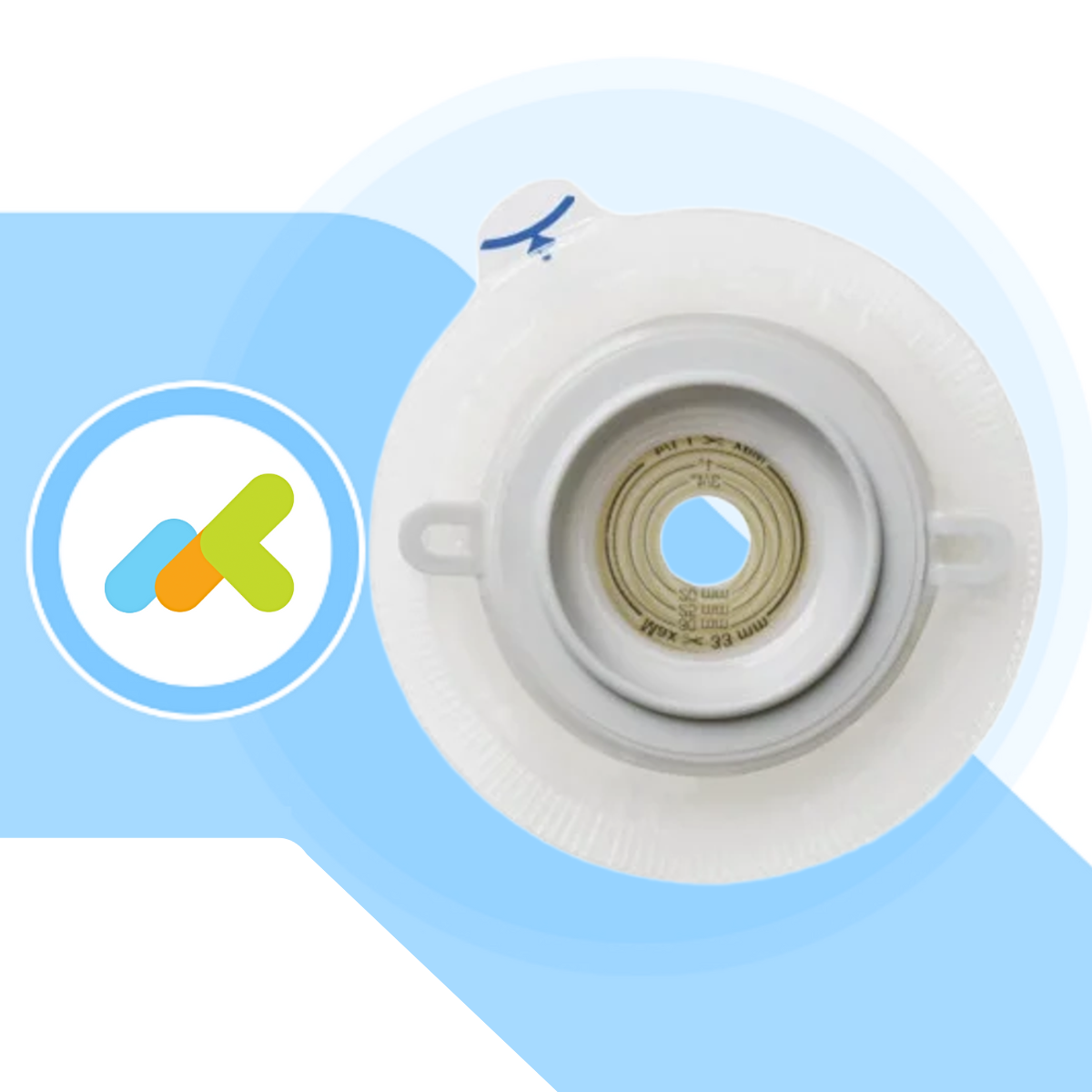 Misura il diametro della stomia e seleziona la flangia più vicina; in alternativa ritaglia la placca seguendo la guida stampata sulla carta siliconata. Consulta il tuo medico o infermiere stomaterapista per assistenza alla misura.
