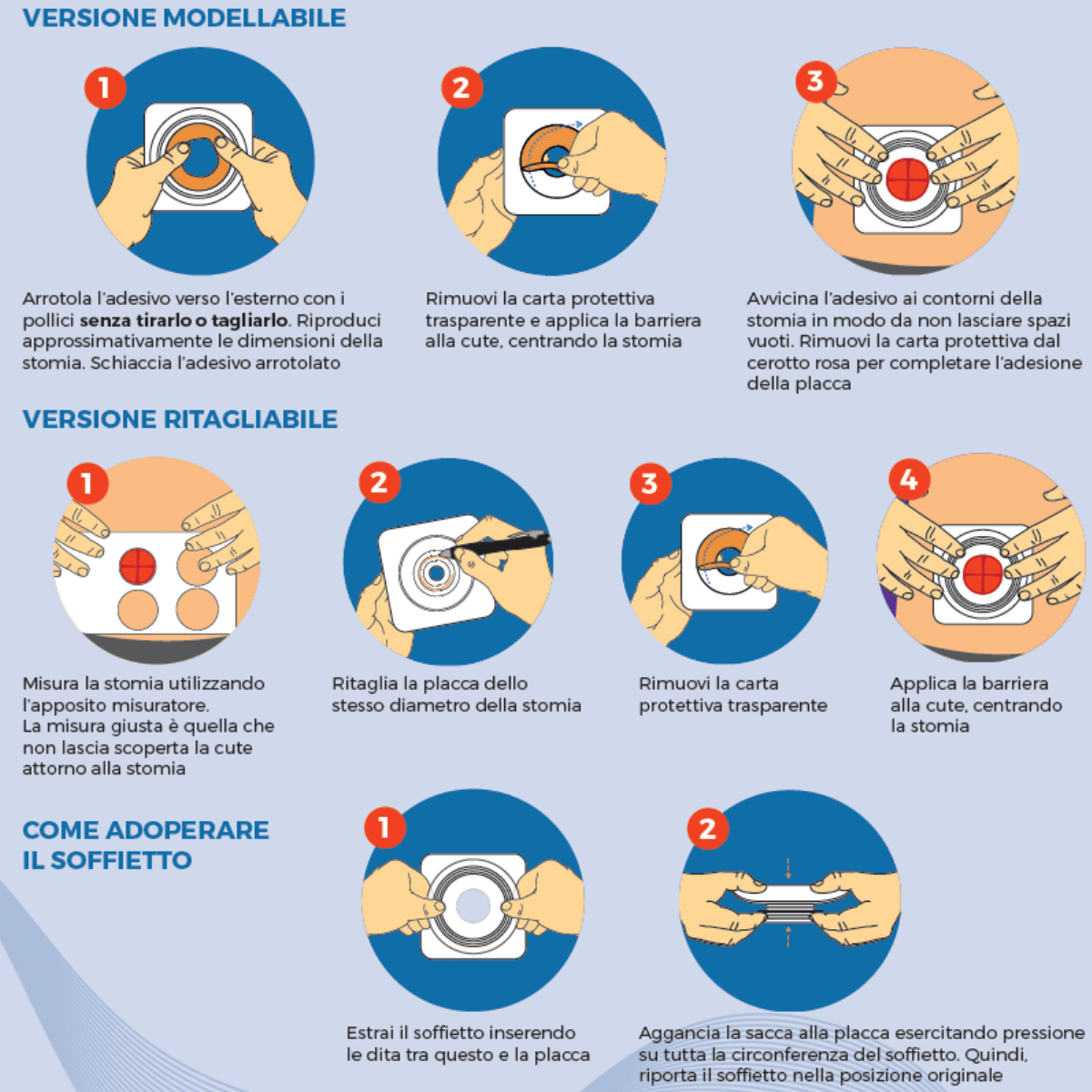 - Le placche sono adatte a tutti i pazienti stomizzati, inclusi quelli con scarsa manualità, grazie alla semplicità di applicazione e alla tecnologia modellabile che non richiede particolari competenze tecniche.