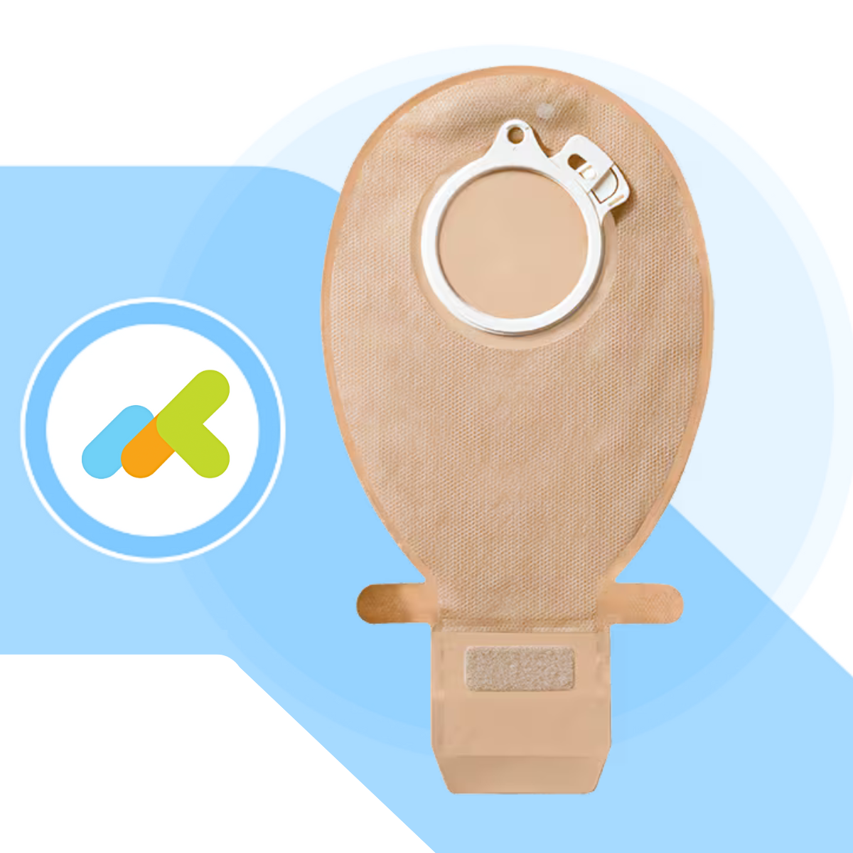 - È un dispositivo per ileostomia a due pezzi con adesivo a doppio strato, click sonoro e chiusura a tripla sicurezza.