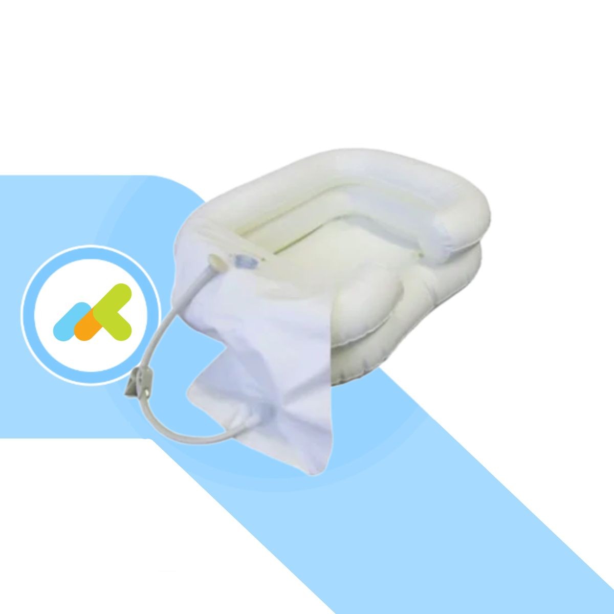 Kit lavaggio capelli completo con vaschetta gonfiabile ergonomica, sistema di scarico dell’acqua integrato e sacca con tubo flessibile. Ideale per pazienti allettati, assistenza domiciliare e strutture sanitarie.